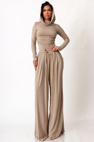 SOLID HOODED LONG SLEEVE CROP TOP AND WIDE LEG PANTS SET